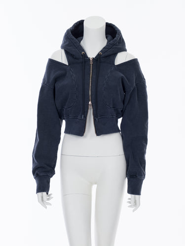 肩にスリットの入ったAKIKOAOKIらしいディテールが特徴的なフロントジップのフーディー。