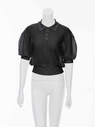 透け感のある素材を使用したポロシャツディテールのトップス。