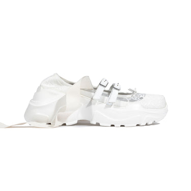 トゥシューズの様なスクエアトゥやリボンディテールでバレリーナをイメージしたシューズ。2本のバックルとリボンストラップがアクセントとなる女性らしいアッパーにスニーカーソールを融合させた1足です。