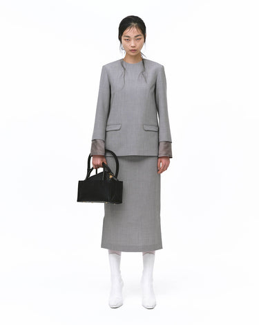 腰回りはサテンの生地を使用しており、切替から下にはウール梳毛生地を使用しております。異素材の組み合わせがありつつもシンプルなシルエットで、どんなトップスにも合わせやすく、着回しのしやすいアイテムです。
