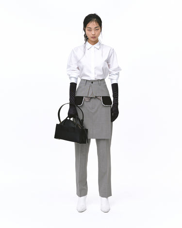 裏地のカットオフや、裾からポケットの袋布が覗いているディテールが特徴的なアイテムです。フロントにはファスナーとボタンが2箇所についているので、サイズ調整が可能です。
