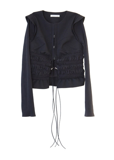軽量でフィット感のあるウールジャケット。シュリンクしたウエストとミニマムなリブ袖が、よりフェミニンさを強調しています。
